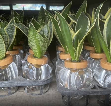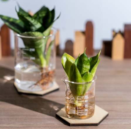 • 容器: 透明玻璃瓶、塑膠瓶、水培專用瓶、甚至漂亮的馬克杯、燒杯都可以!透明的好處是可以隨時觀察根系和水質。瓶口大小要合適,能讓植株 根部懸空,莖基部 不要泡在水裡(離水面至少0.5-1公分),靠根尖部分吸水就好。我特別喜歡用喝完的玻璃酸奶瓶,大小剛好。