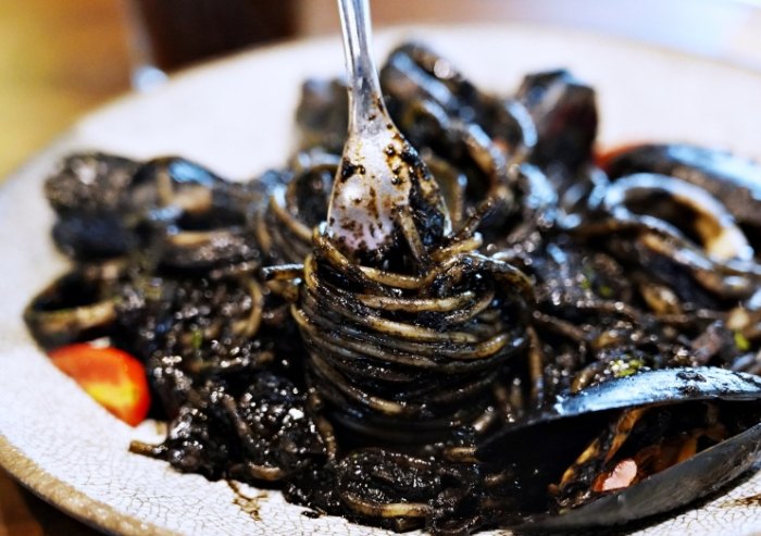 - 蒜辣海鮮墨魚汁義大利麵: 黑嚕嚕的墨魚麵,海鮮料給得大方,蒜辣口味很夠勁,視覺和味覺都很滿足。算是招牌之一。