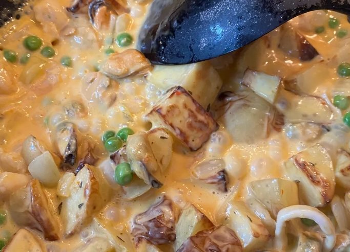 5. 注入南洋風: 倒入椰漿,加入魚露和棕櫚糖調味。稍微攪拌均勻(動作要輕柔)。